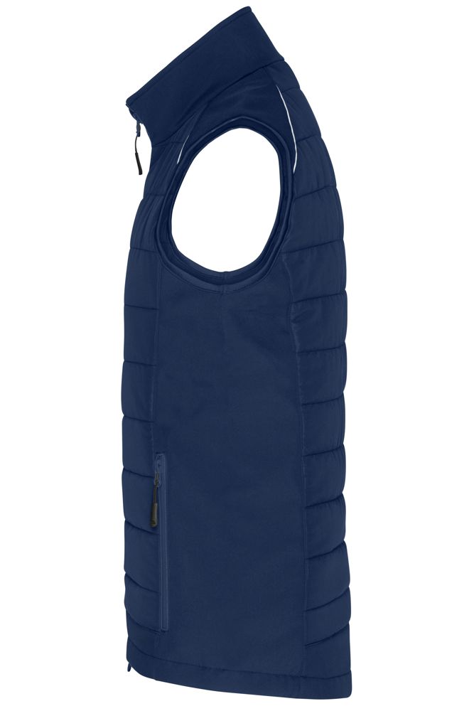 Pflegeleichtes 2-Lagen Softshellmaterial kombiniert mit gesteppten Einsätzen im Vorder- und Rückenteil