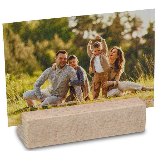 Ein Foto der Liebsten, Bilder oder dekorative Sprüche-Karten lassen sich in dem hochwertigen Bildhalter aus Holz überall in Szene setzen. Die Werbebotschaft erfolgt individuell auf der Banderole. Eine Lasergravur auf dem Holz stellt eine langlebige und positive Verbindung zum werbenden Unternehmen her.