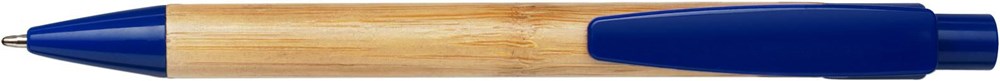 Kugelschreiber aus Bambus, mit Applikationen aus Kunststoff und blauer Mine.
