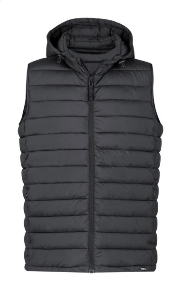 Wind- und wasserabweisende Bodywarmer-Weste mit Reißverschluss, Seitentaschen mit Reißverschluss und verstellbarer Kapuze. Mit RPET-Polyester-Beutel. Material: 100 % RPET-Polyester. Mit RPET-Label.