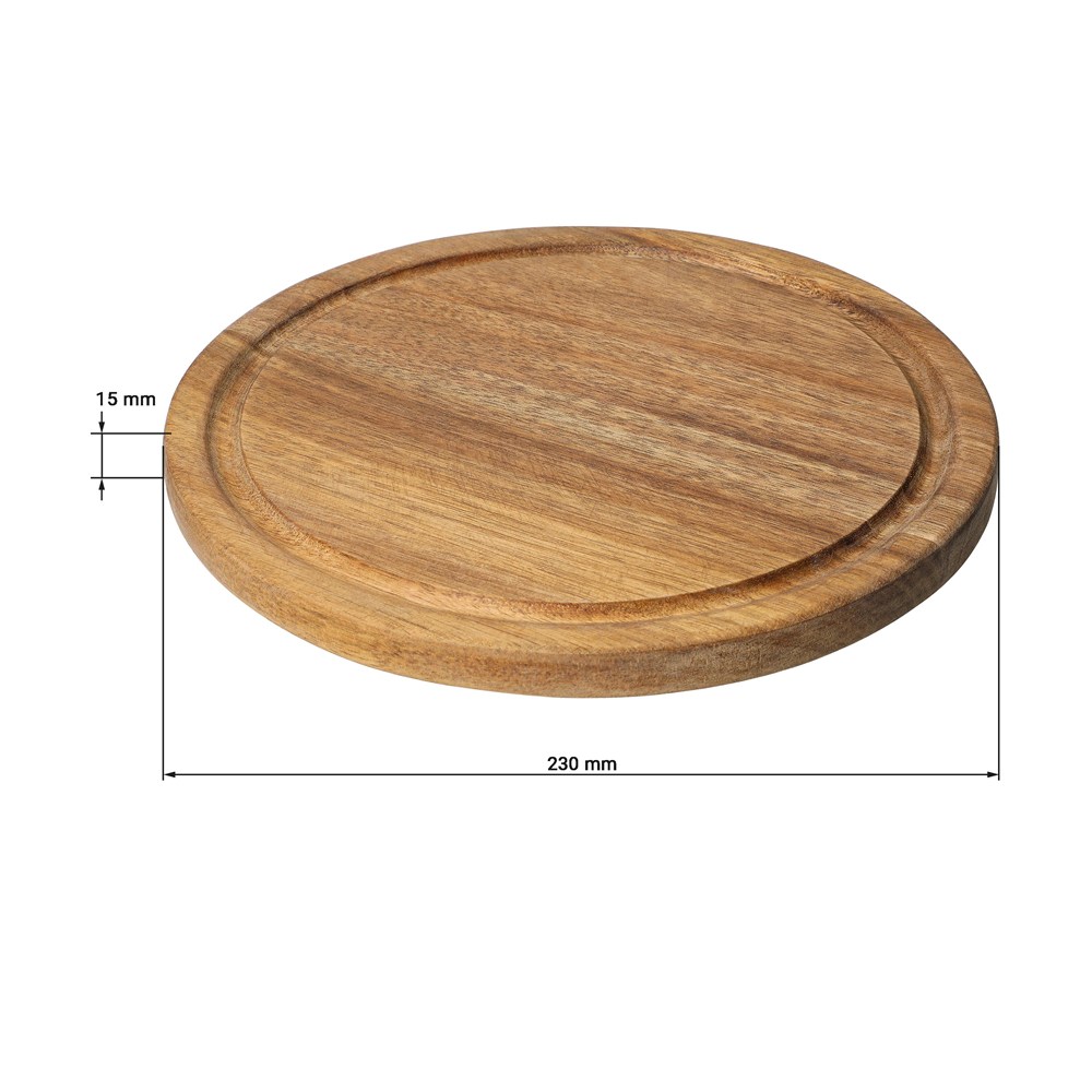 Das runde "Acacia" Schneidbrett (Ø 23 cm, 15 mm dick) aus Akazienholz verfügt über eine integrierte Saftrille. Seine Behandlung mit Sojabohnenöl schützt das Holz und erhält die Ästhetik. Ideal für tägliche Kücheneinsätze, empfiehlt sich die Handwäsche zur Pflege.