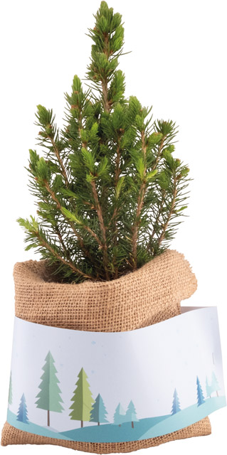 Eine lebende Zuckerhutfichte 20 - 30 cm, verpackt in einer Einzelversandkartonage, als kleines Bäumchen zu Weihnachten. Klassisch und dekorativ versetzt diese Zuckerhutfichte jeden Raum in eine weihnachtliche Stimmung. Deko für den Topf: Jute mit Papierbanderole. Die Banderole kann im Standardmotiv mit Ihrer Werbebotschaft versehen werden, oder, ebenfalls ab 100 Stück, komplett individuell gestaltet werden. Das Bäumchen kann auf Wunsch von uns direkt an einzelne Empfänger versendet werden. Zudem steht als Werbefläche ein separater Schuber, Art.-Nr. 4199-8, zur Verfügung.