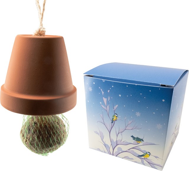 Ein komplettes Futterhäuschen für die heimischen Wintervögel. Einfach den Meisenknödel mit der Schnur an der Futterstation befestigen und aufhängen. Die Präsentpackung kann ab 250 Stück mit Ihrem Logo versehen oder individuell gestaltet werden.