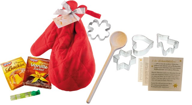 Inhalt: Rezeptleporello, Rührlöffel, Vanillezucker, Zitronenaroma, Backpulver, 4 Ausstechformen, je ca. 5 cm (Stern, Tannenbaum, Kleeblatt, Herz)